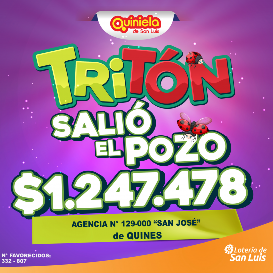 En el sorteo Vespertino del día viernes 15 de Diciembre, hubo un ganador del pozo del Tritón con los números 332 y 807. El afortunado apostador jugó en la Agencia Nº 129-000 "San José" de Quines y se llevó el premio de $1.247.478
