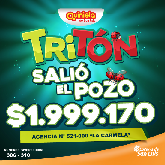En el sorteo "Nocturno" del día Viernes 10 de Octubre, hubo un ganador del pozo del Tritón con los números: 386 - 310