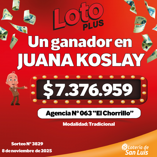 Un ganador con el Loto Plus en la provincia de San Luis; en esta oportunidad se alzó con un premio de $7.376.959,81 en la modalidad “Tradicional”. La apuesta ganadora se realizó en la localidad de Juana Koslay más precisamente en la agencia 063-000 “El Chorrillo”, situada en la Avenida del Viento Chorrillero 273. En esta oportunidad, el agenciero vendedor del ticket no se lleva un “premio estímulo” por haber sido premio con cinco aciertos. El concurso fue el N° 3.829 y se llevó a cabo el sábado por la noche, donde hubo, entre varios premios, 2 ganadores en toda la Argentina de la modalidad “Tradicional” con 5 aciertos. -El Loto Plus sortea miércoles y sábados a las 22 hs. El próximo sorteo será el miércoles 12 de noviembre y el pozo estimado será de $23.463.000.000.-El valor de la apuesta es de $2.500 y se pueden realizar en cualquier agencia de Lotería de San Luis.